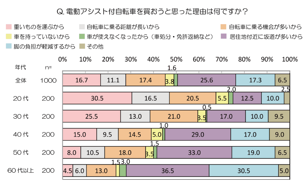 さらに、ある調査では「電動アシスト付自転車の保有率17.3%」という結果があり、買おうと思った理由として「居住地付近に坂道が多いから」が25.6%でトップというデータもあります。